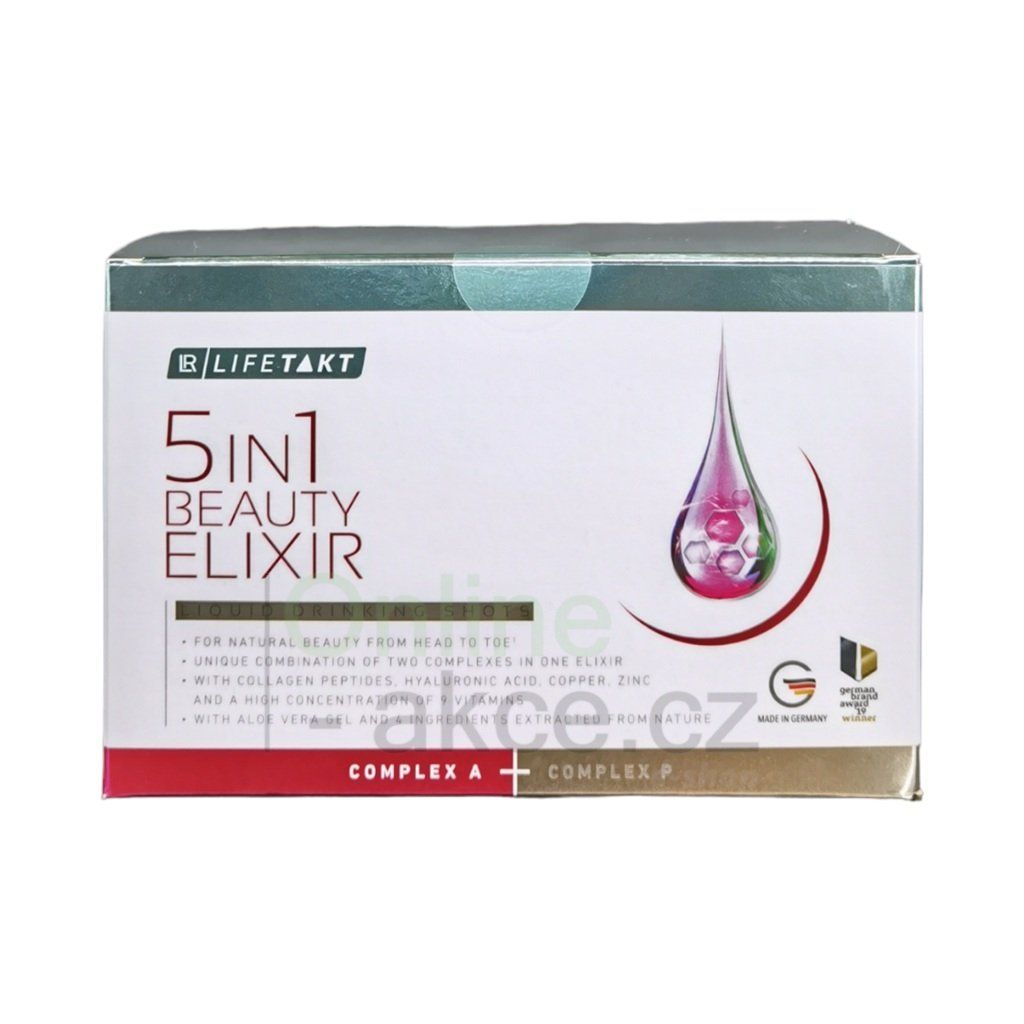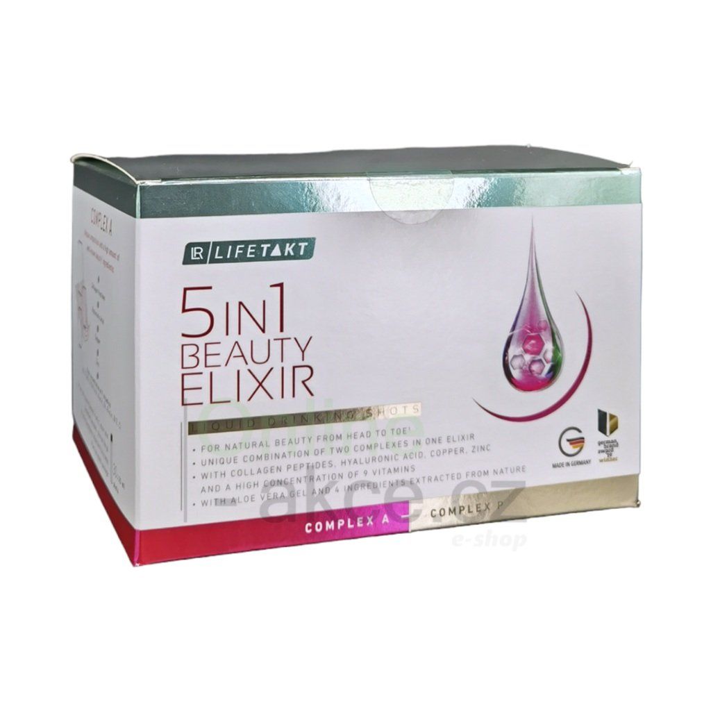 LR LIFETAKT 5in1 Beauty Elixir je prémiový doplněk stravy s vědecky navrženým duálním komplexem, který podporuje přirozenou krásu zevnitř. Spojuje kolagenové peptidy, kyselinu hyaluronovou, měď, zinek a vitamíny A, C, E a B-komplex pro péči o pokožku, vlasy a nehty. Díky pravidelnému užívání přispívá k hydrataci pokožky a její pevnosti, podporuje tvorbu kolagenu a chrání buňky před oxidačním stresem.